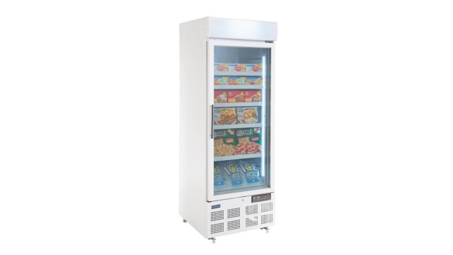 Stijlvolle rechtopstaande display vriezer van Polar, met een deur voorzien van isolerend dubbel glas en een lichtkoof. Deze vriezer is ontworpen voor het effectief merchandisen en presenteren van producten, heeft 5 verstelbare schappen, een verlicht display, LED binnenverlichting, een afsluitbare deur en kleine wielen aan de achterzijde voor eenvoudig manoeuvreren.