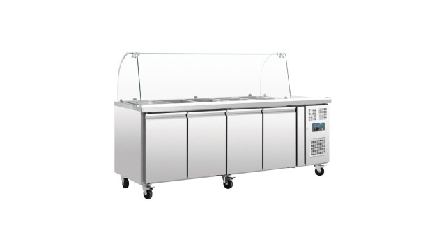 Deze saladette van Polar is een must-have voor saladebars en delicatessenzaken. De werkbank heeft een geforceerd koelsysteem, 4 roosters en is geschikt voor meerdere GN bakken zodat u voedsel op de juiste temperatuur kunt bewaren en serveren. Dankzij de glazen kap kunnen klanten wel het voedsel bekijken, maar wordt het voedsel ook beschermd tegen eventuele bacteriën. Dit komt de hygiëne ten goede. De RVS constructie maakt de saladette zeer duurzaam en robuust en geschikt voor professioneel gebruik. Gastronorm bakken worden apart verkocht.