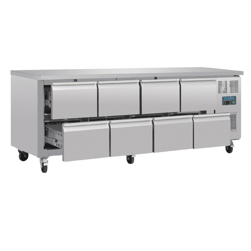 Deze functionele en stevige, gekoelde gastronorm koelwerkbank met lades komt uitstekend van pas in drukke, professionele keukens. De werkbank is voorzien van 8 handige lades die geschikt zijn voor GN 1/1 en een krachtig, geforceerd koelsysteem om ingrediënten en gerechten effectief te koelen, zelfs in een zeer warme omgeving en wanneer de deur regelmatig open en dichtgaat. U kan de werkbank bovendien gebruiken om keukenapparatuur op te plaatsen, zoals een grill en warmhoudplaat. Omdat de werkbank vervaardigd is uit RVS is deze zeer stevig en robuust en gaat hij lang mee, ook bij veelvuldig gebruik in een professionele keuken.