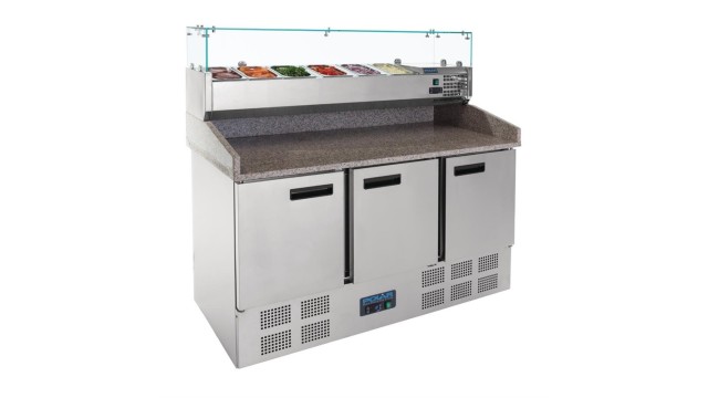 De counter heeft een ruime inhoud, zodat u grote hoeveelheden ingrediënten gekoeld kunt bewaren achter de 3 RVS deuren, terwijl u met de koelvitrine uw meest gebruikte producten altijd snel en koel binnen handbereik heeft. Het sterke granieten werkblad is perfect voor pizzabereiding, aangezien het graniet sterk is en koel blijft wat ideaal is voor het kneden van deeg.